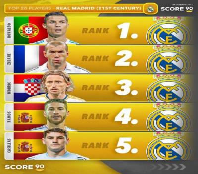 体育资讯11月13日报道宣称 著名足球自媒体S90评选了皇马21世纪最佳20人,C罗、齐祖、魔笛前3,劳尔第8大罗第9。