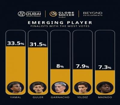 体育资讯12月7日报道宣称 环球足球奖公布了最佳新秀的投票情况,亚马尔33.5%领跑,居勒尔31.5%次席,最终获奖者将参考官方评审团的意见,并不完全由投票决定。