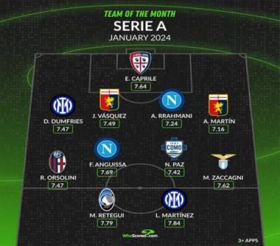 体育资讯2月3日报道宣称 whoscored统计了意甲1月评分最佳阵容,国米、那不勒斯、热那亚均2人入围。
